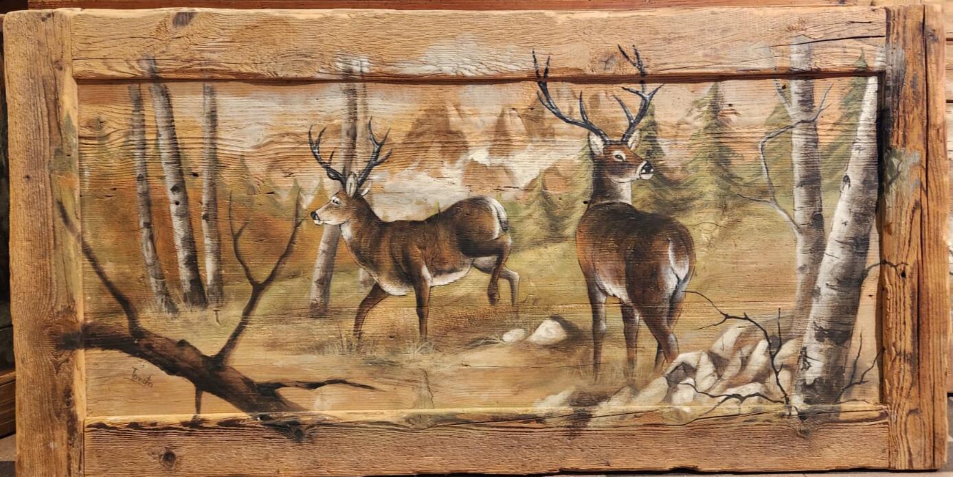 Quadro su tavole di legno vecchio dipinto a mano raffigurante cervi in piedi 140x70 cm €750,00 750,00 Acquista Quadro dipinto a mano su tavola di legno vecchio raffigurante cervi in piedi.Misure 140x70 cm circaPezzo unico