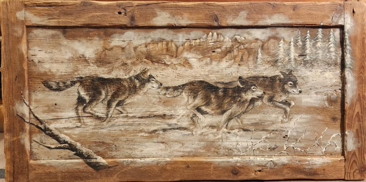 Quadro su tavole di legno vecchio dipinto a mano raffigurante lupi in corsa140x70 cm €750,00 750,00 Acquista Quadro dipinto a mano su tavola di legno vecchio raffigurante lupi in corsa.Misure 140x70 cm circaPezzo unico