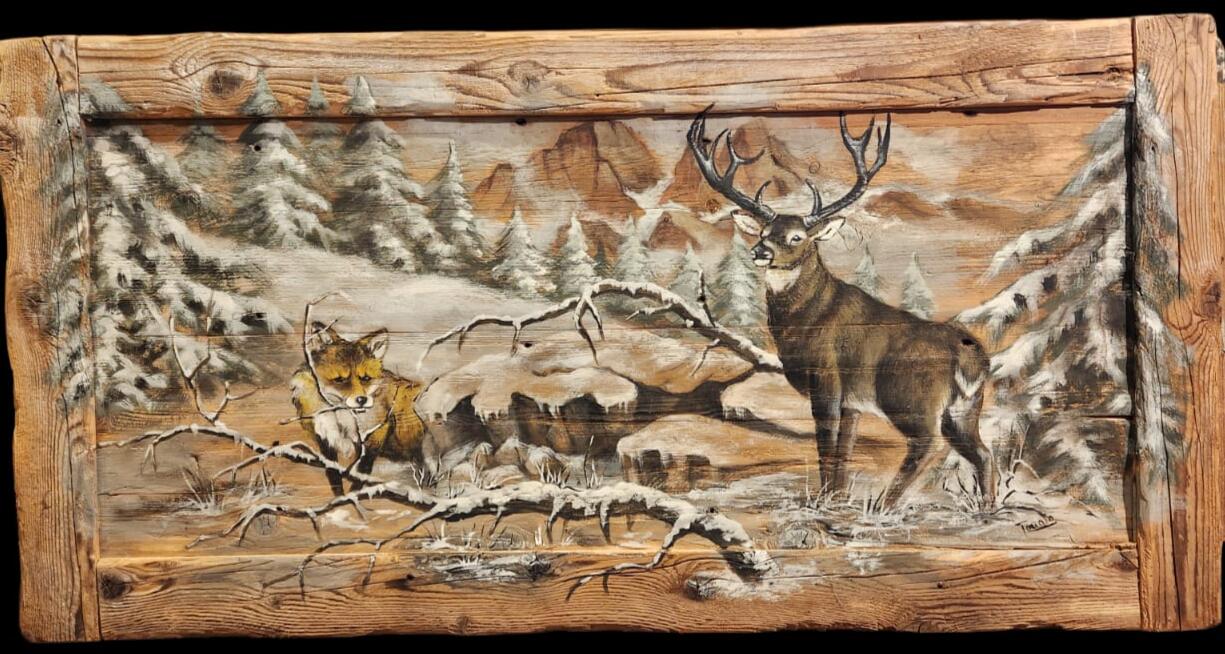 Quadro su tavole di legno vecchio dipinto a mano raffigurante una volpe e un cervo 140x70 cm €750,00 750,00 Acquista Quadro dipinto a mano su tavola di legno vecchio raffigurante una volpe e un cervo.Misure 140x70 cm circaPezzo unico